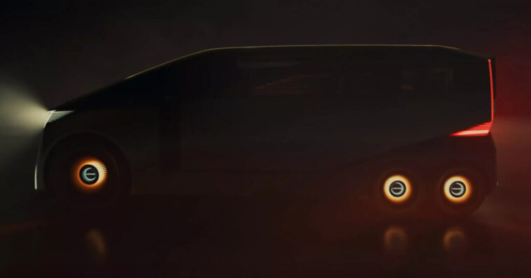 Помимо необычной компоновки колес, выделяются вертикальные светодиодные фары и задние фонари, растянутые на боковины, а также светящийся плавник на крыше. Широкая сдвижная дверь открывает доступ в просторный салон с мягким освещением и шестиместной трехрядной конфигурацией.