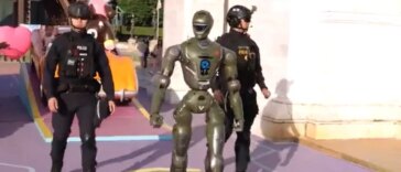 У мережі з’явилося відео з південнокитайського міста Шеньчжень, у якому людиноподібний робот крокує поруч із офіцерами поліції у формі під час патрулювання.