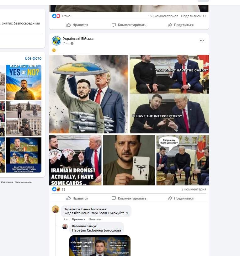 Все это разгоняется лайками и начальными комментариями, опять же ботовыми, чтоб этот шлак информационный к вам в ленту ФБ попадал. Ну а дальше подключаются идиоты, которые поздравляют по 5 раз в день нарисованных нейросетью воинов с разными праздниками — увеличивая видимость таких постов. И по 5 раз в день лайкающих Зелю с комментарием: «Нам тебя бог послал». И вот этот мусор несется по ленте новостей ФБ.